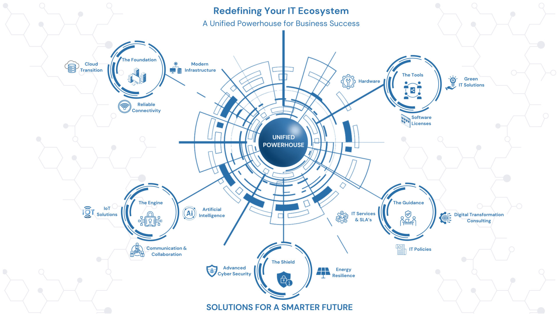 infrastructure (networking, Wi-Fi, hosting, connectivity), hardware procurement from top global brands, software licensing (Google, Microsoft, NetSupport, Adobe), and specialised systems such as PBX communication, CCTV security, and solar power. Their